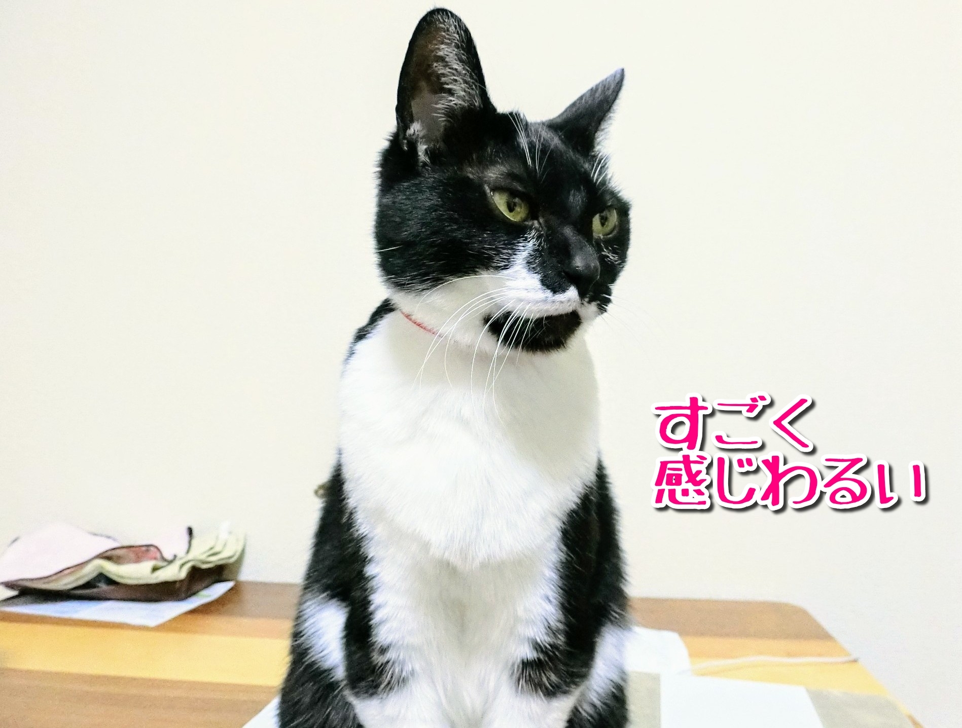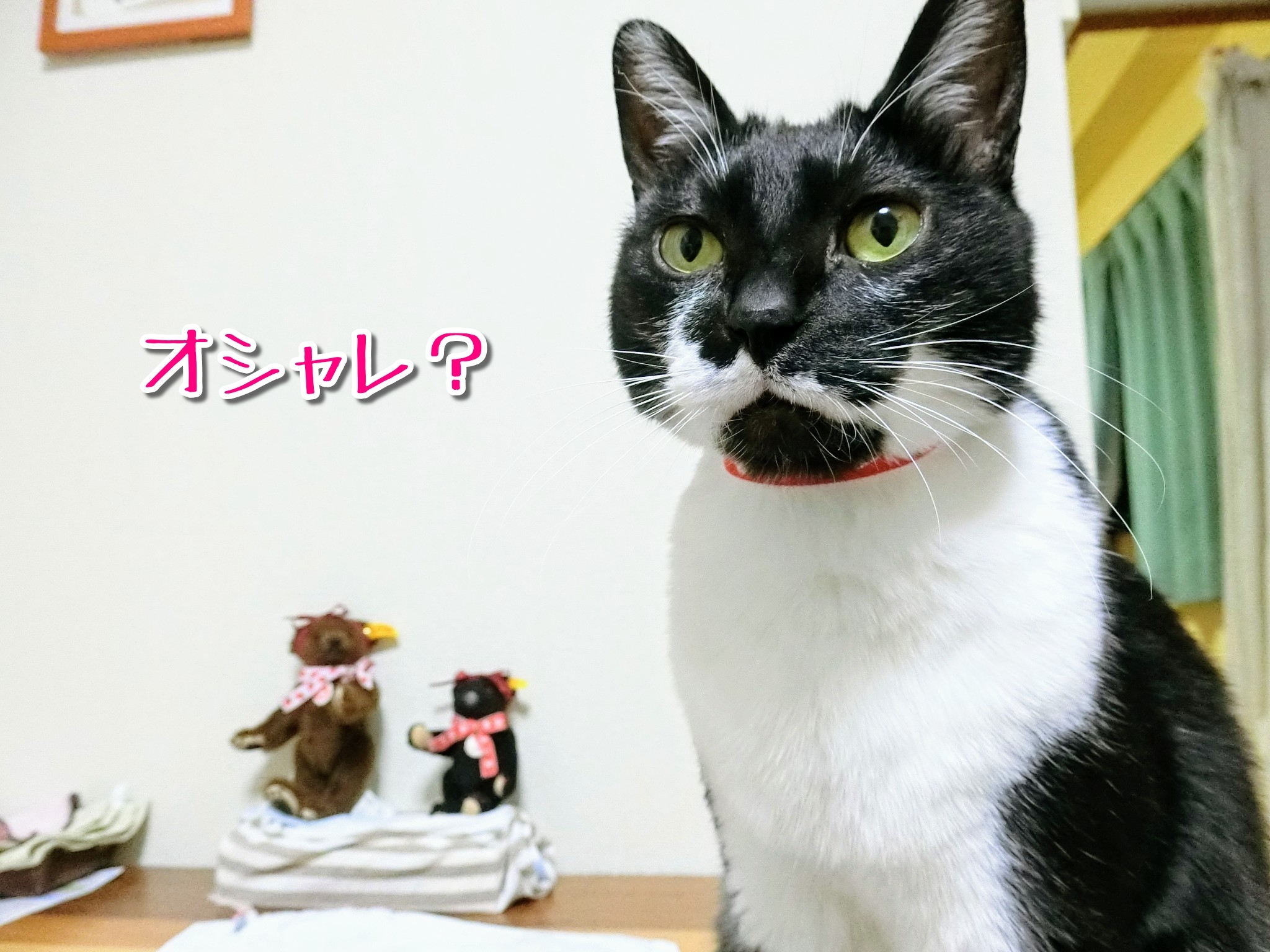 白黒猫、意外に似合う色が少ないと思うんですよね。青とか緑とか、赤以外の原色系はほぼダメな気がします。これが黒猫や白猫なら何色でも似合うのに… 不思議です。ただの思い込ですかね??